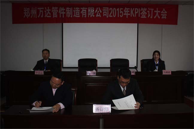 郑州九游体育管件制造有限公司2015年KPI签订会于1月30号在公司行政区会议室隆重举行,公司班长以上所有管理人员参加了此次签订会议。签订会分为三级签订,即:董事长与总经理签订、总经理与公司各高管签订、公司各高管与分管的各部门负责人签订,近期,各部门负责人将部门的KPI指标进行分解,与各班组及相关岗位签订目标责任书,达到“千斤重担人人挑,人人肩上有指标”的责任分解领受,确保最终顺利完成公司2015年度各项任务和目标。
