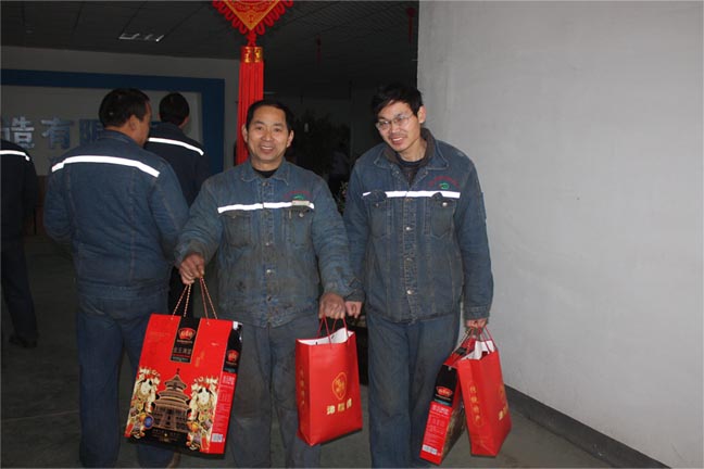 为感谢全体员工一年来的辛勤工作,祝福员工度过一个欢乐喜庆的新年,公司本着,一切以为员工谋福利的原则,为每位员工购置了礼品(若羌大枣、稻花香金玉满堂)。让员工把公司温暖带回家。