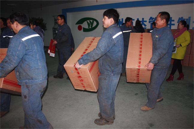 为感谢全体员工一年来的辛勤工作,祝福员工度过一个欢乐喜庆的新年,公司本着,一切以为员工谋福利的原则,为每位员工购置了礼品(若羌大枣、稻花香金玉满堂)。让员工把公司温暖带回家。